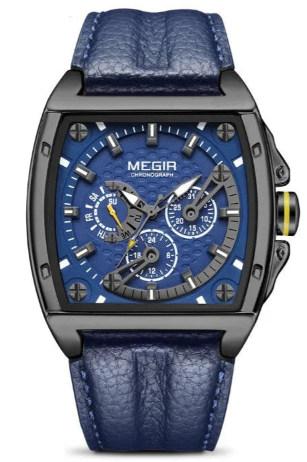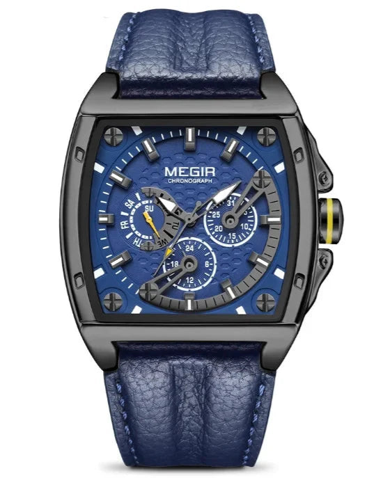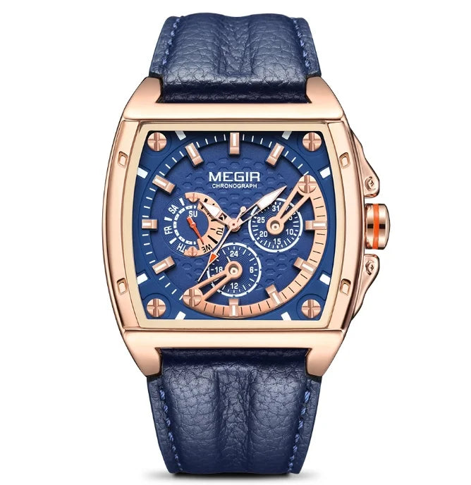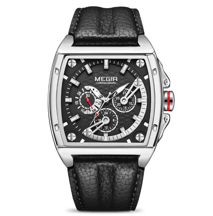 Design quadrado, esportivo e moderno. Pulseira de couro. Movimento de quartzo. À prova d’água. Mostrador luminoso. Tudo o que você precisa — sem excessos.